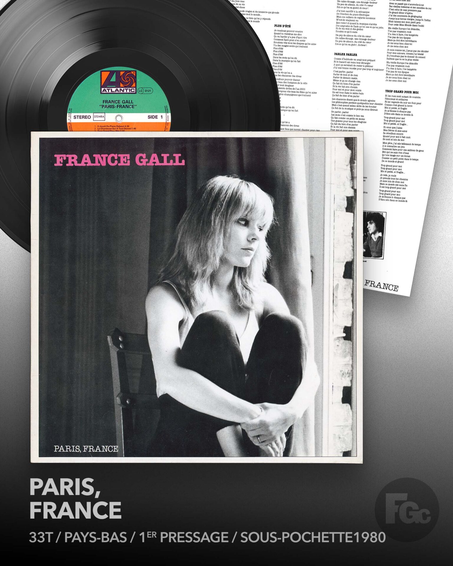 Mentions légales & crédits | France Gall | Album : Paris-France | Atlantic | LC 0121 | Société : Stemra | Pays-Bas | Side 1 / Side 2 | Référence : ATL 50707 | 50 707-A / 50 707-B | Paroles et musique : Michel Berger | P.E.M. Colline | (P) 1980 WEA Filipacchi Music | Adresse : 75008 Paris, 70 Champs Elysées | Piano : Michel Berger | Synthétiseurs, Orgue Hammond, piano électrique : George Rodi (sauf Ma vieille Europe, Michel Berger) | Basse : Janick Top | Guitares : Slim Pezin | Percussions : Marc Chantereau | Batterie : Simon Philips | Sax ; Clarinette, Flûte : Patrick Bourgoin | Chœurs : Bernard Ilous et France Gall | Enregistrement et mixage : Jean-Pierre Janiaud et Patrick Foulon (Studios Gang, Paris) | Gravure : Translab | Photos et réalisation : Michel Berger pour les P.E.M. Colline | Paroles et Musique : Michel Berger | Avec l’aimable autorisation des Éditions Colline | Made in Germany by WEA Musik GmbH • A Warner Communications Company. (Fabriqué en Allemagne par WEA Musik GmbH – Une société Warner Communications.)